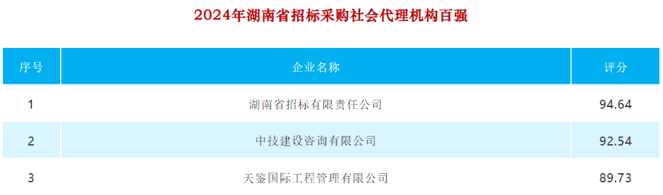 我司榮膺2024年湖南省招標采購社會代理機構TOP100