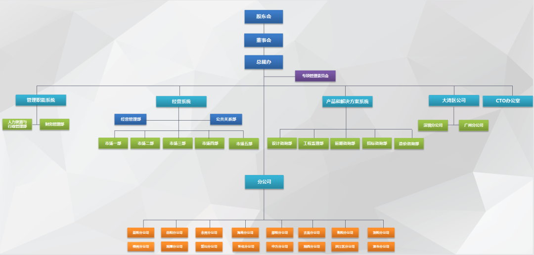 永信和瑞工程咨詢有限公司實行股東會領導下的董事會負責制,董事會下設總裁辦,對內掌管公司事務、對外代表公司經營,并統籌管理職能系統、經營系統、產品和解決方案系統、CTO辦公室、大灣區公司;另設專項管理委員會負責公司管理,及專業方向引領和質量管控,為公司各領域提供技術支持和專業培訓。?