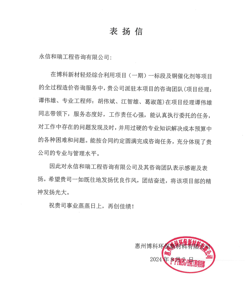 8月7日,我司派駐博科新材輕烴綜合利用項(xiàng)目(一期)一標(biāo)段及銅催化劑等項(xiàng)目進(jìn)行全過(guò)程造價(jià)咨詢(xún)服務(wù)的項(xiàng)目經(jīng)理譚偉雄,專(zhuān)業(yè)工程師胡偉斌、江智雄、葛淑蓮圓滿(mǎn)完成咨詢(xún)服務(wù),收到了來(lái)自惠州博科環(huán)保新材料有限公司的表?yè)P(yáng)信。
